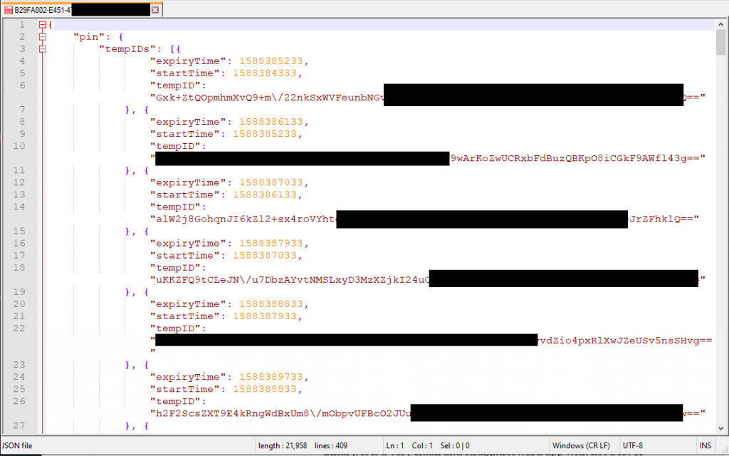 The forward-dated tempIDs were found in a file under Library\Caches\ca.ab.gov.ahs.contacttracing\fsCachedData\{GUID} . The contents of the file is shown here but redacted slightly to not show the full tokens: