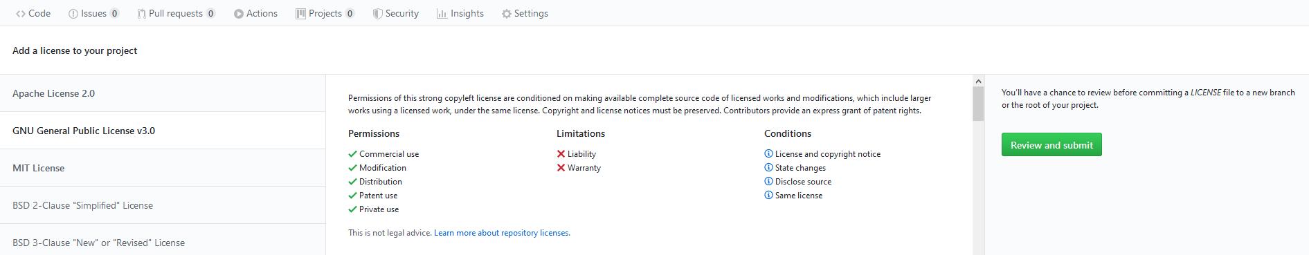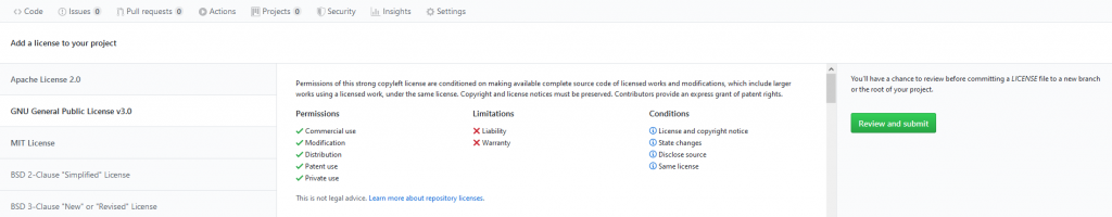 From here, you can select different licenses (the popular ones like Apache, GPL, and MIT are listed at the top) and review their differences. Once ready, click 'Review and submit'.