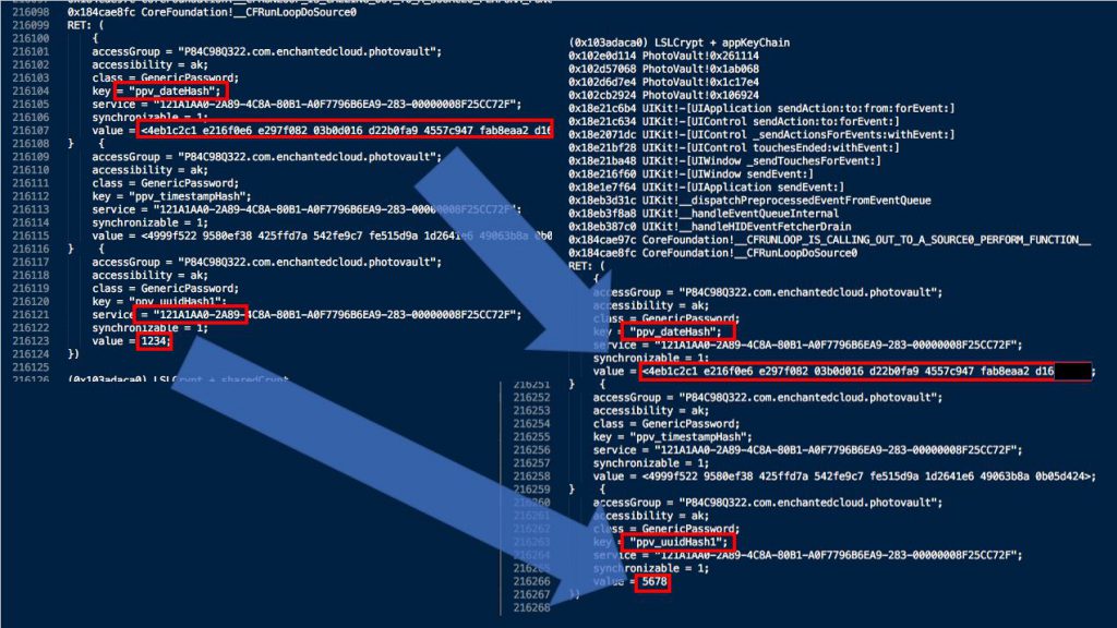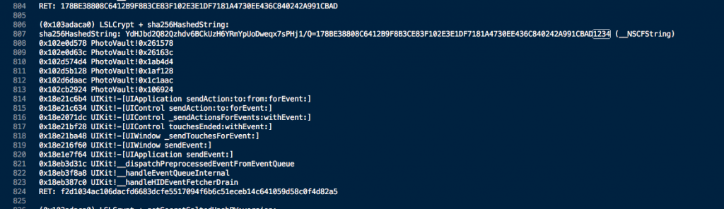 - Switched back and forth between Hopper and Frida console until I established a good idea of what was going on. The biggest breakthrough here was that the encryption key doesn't change when you change the passcode, and that it is stored in keychain.plist