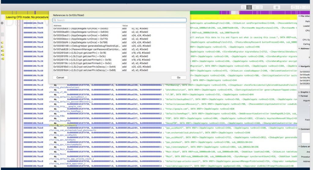 - Conducted static analysis of decrypted binary using Hopper . I had great success with searching for a value from the plist I believed to be associated to crypto. This app is not free but the trial is fully functional for 15 minutes - make sure you hurry! :)